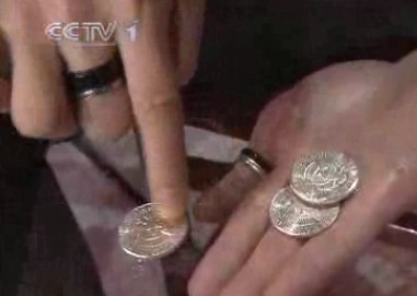 我发现刘谦手拿起硬币回收时,手是有抖动且移动的(董卿碰刘谦手时,刘谦手有向硬币处移动),尤其是在靠近桌面时,手有微缩反映,我想这也许多半是手穿过了一一定大小的孔,而回收时手难免碰擦了孔面。
